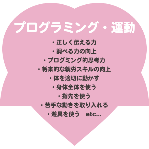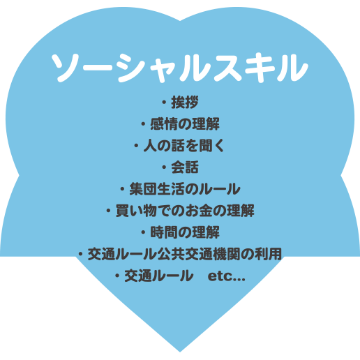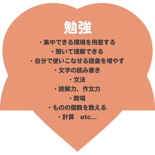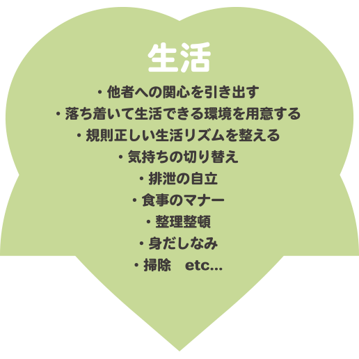 食事や排泄などの「生活」、身体能力を高める「運動」、挨拶・会話・マナーなど社会的に充実した生活のための「ソーシャルスキル」、読み書き算数を始めとする「勉強」、などの各面について、総合的に発達を促していきます。